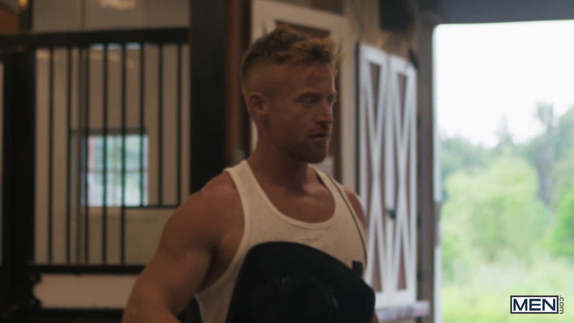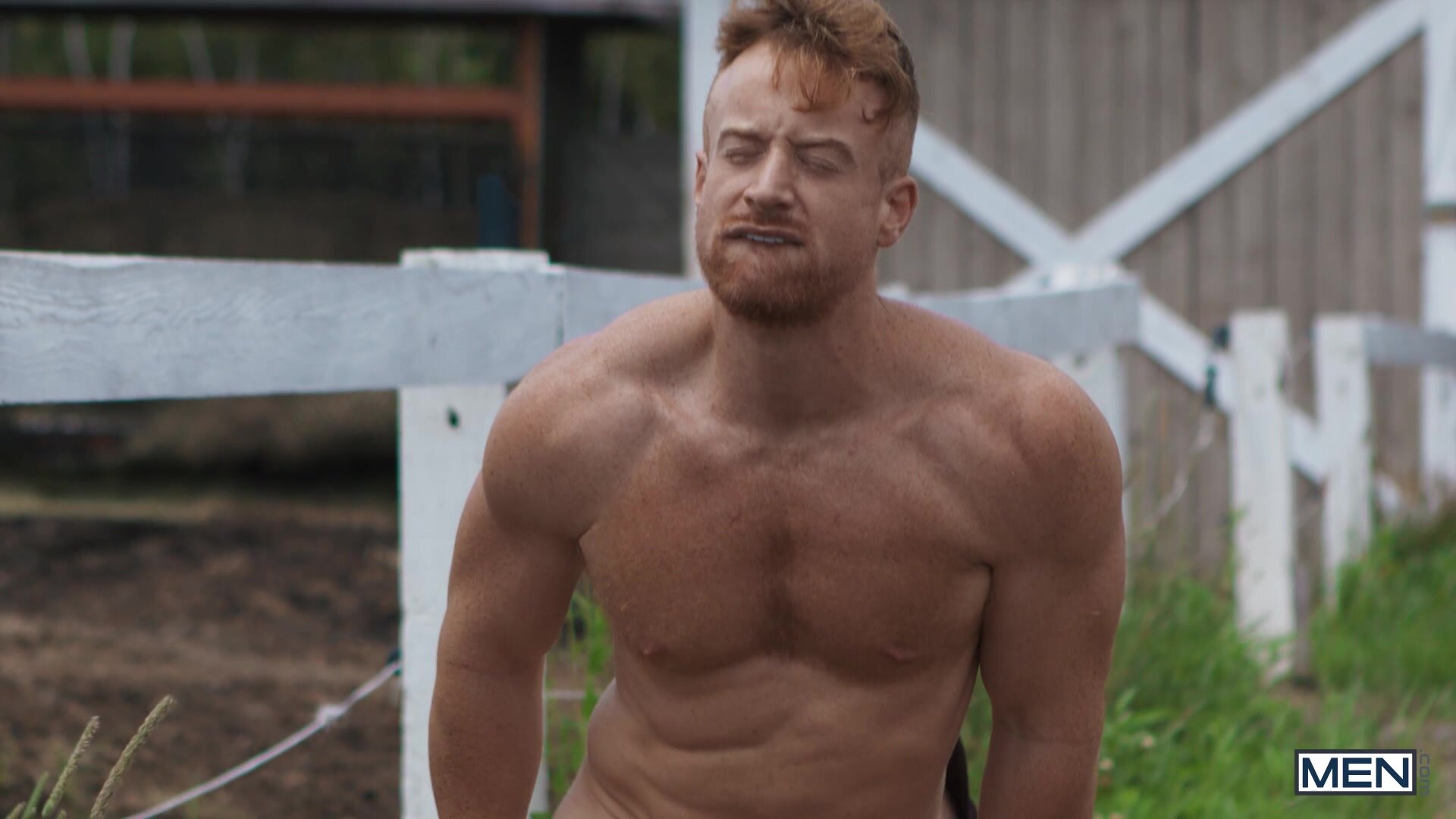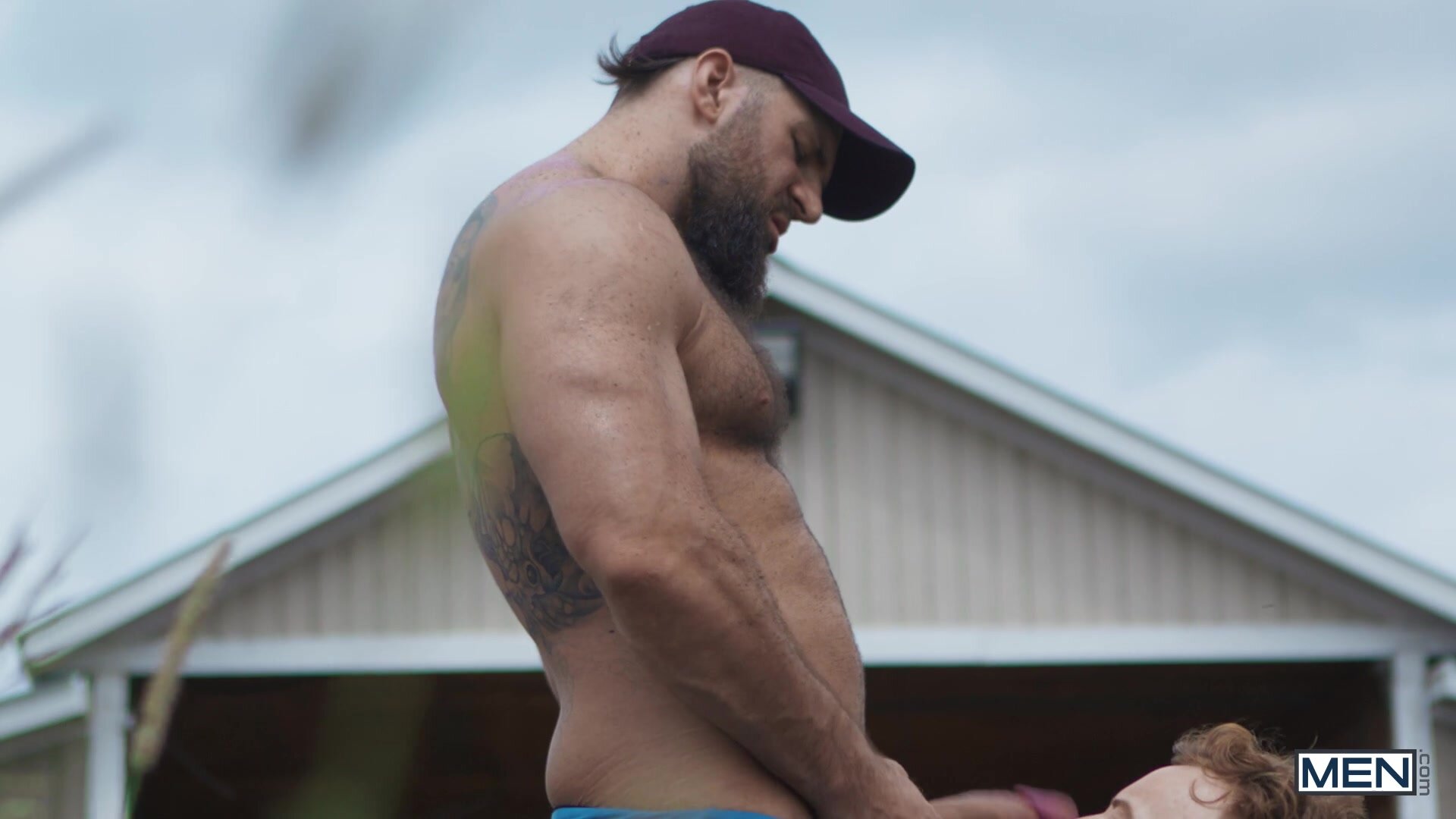 Years after leaving his home in the country without saying goodbye, Tim James is finally back... but he won't be accepted as easily as just putting his cowboy hat back on. Tim strikes up a flirtation with ranch hand Chuck Conrad, and the big burly hunk takes a break from his labor for Tim to suck his cock, then fucks the bottom over a hay bale. Tim gets pounded on his back, then cums as he rides that huge dick for all he's worth, and cowboy Chuck eases his blue balls with a load on Tim's face.