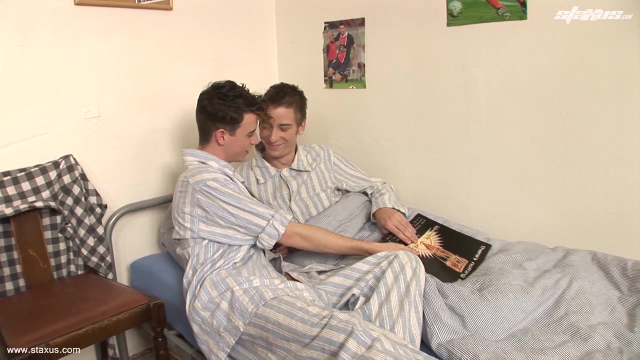 Tom gets a significant spitroasting in this schoolboy threesome video,