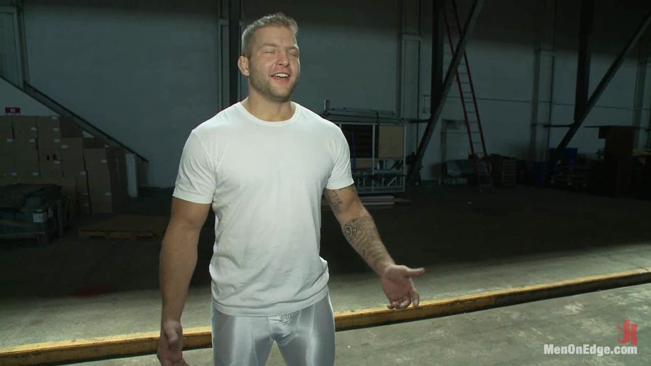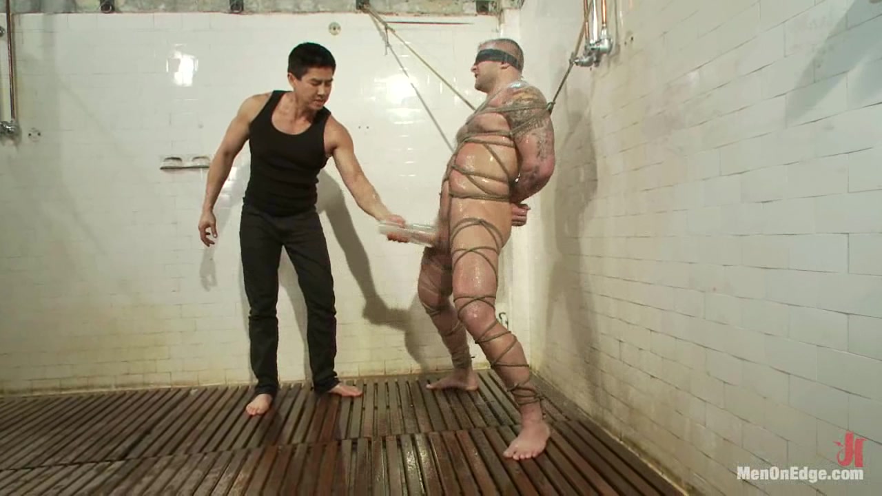 Colby Jansen is a big guy who's taking some time away from married life to be tied up and edged. In the locker room he's tied tight as we manhandle him and get his cock hard. The vibrator makes him horny and he tastes his own precum. With his nipples clamped and tied to the walls we jack him off making him pull his nipples as he squirms. He gets the hell flogged out of him as he stands on one leg and begs to cum through the gag. In the shower Colby is anxious to cum but first we tie him in full body bondage and let the water tighten the ropes around him. He finally blows his load and endures the post orgasm torment.